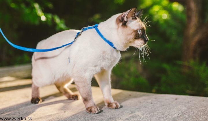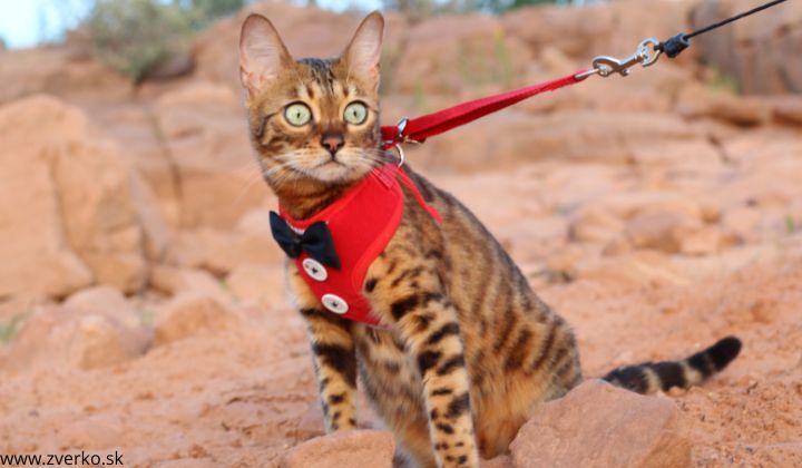 - Zvyknutie si na obojok a vodítko: Začnite tým, že necháte mačku zvyknúť si na obojok a vodítko vo vnútri domu.