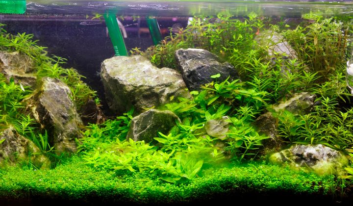 - Umiestnenie v akváriu: Vhodné na zakrytie podkladu, koreňov alebo skál.